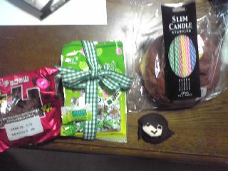 今日はいろんな人にお祝いもらって嬉しかったですvそしてまず朝一番に雲南に覇王様もらって、姉御に三天才セット(今勝手に命名)もらって、パンピの友人に購買で買ったパンとか飴とかもらいました。英語塾行ったらタイムリーに先生が自家製のジャムくれて…なんだこのミラコー(笑)